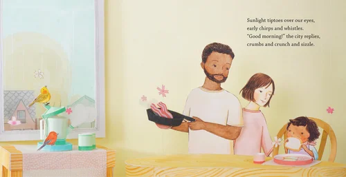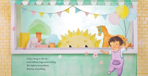 On a beautiful, sunny morning, a family runs errands along a city street. They visit a bakery, flower shop and fruit market. Exuberant in sounds and sights—a baker sugaring tarts, flowers greeting passers-by and pigeons cooing—the story ends as a new day of sparkling possibility begins. Written in pantoum form and illustrated with delightful three-dimensional diorama images that play with light and shadow, When Sunlight Tiptoes is sure to brighten the day of our littlest readers.